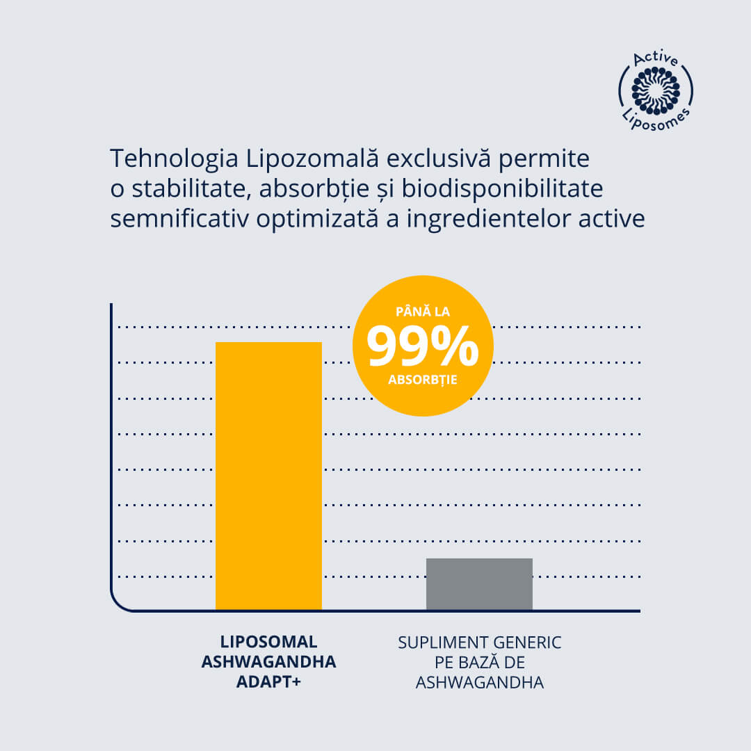 Liposomal Ashwagandha Adapt+ oferă 160 mg de extract standardizat, cu 8 mg de withanolide active, încorporate într-o formulă lipozomală avansată care asigură o absorbție crescută și acțiune eficientă direct la nivel celular.